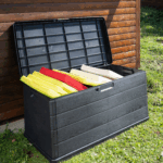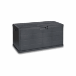 Indoor and outdoor storage trunk with built-in wheels and a lockable feature.